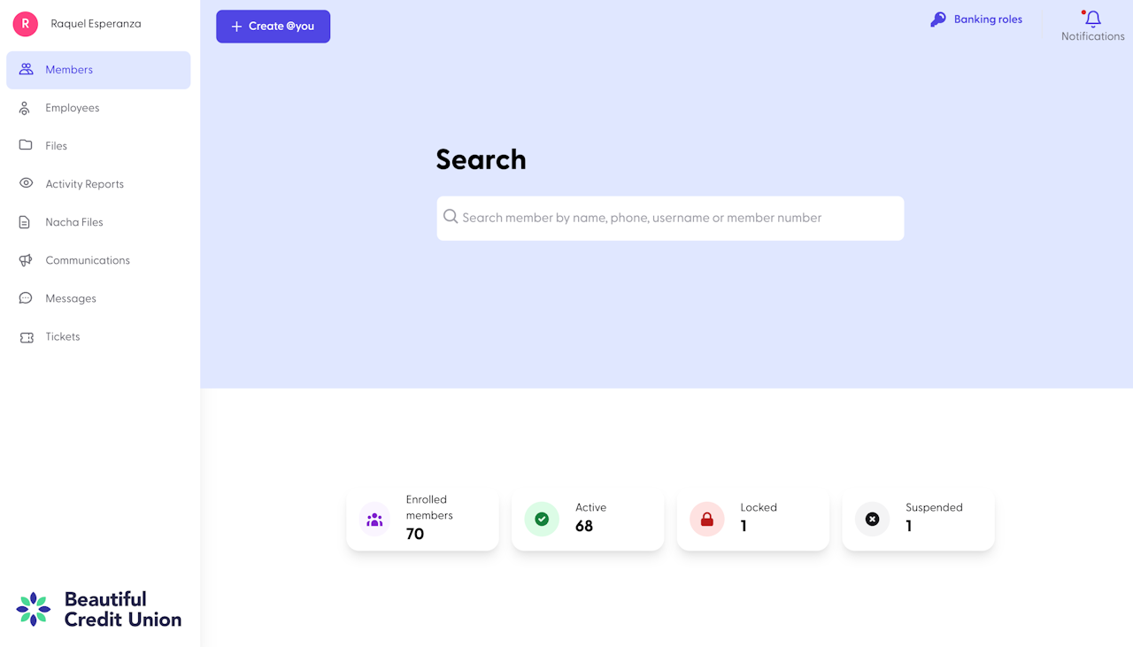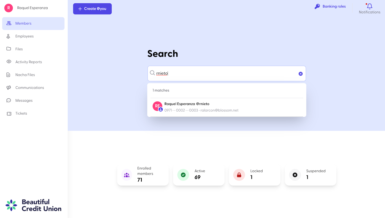 In the “Members” tab, you’ll be able to search for any member’s online banking profile using many items: their @you, full name, email address, phone number or member number.